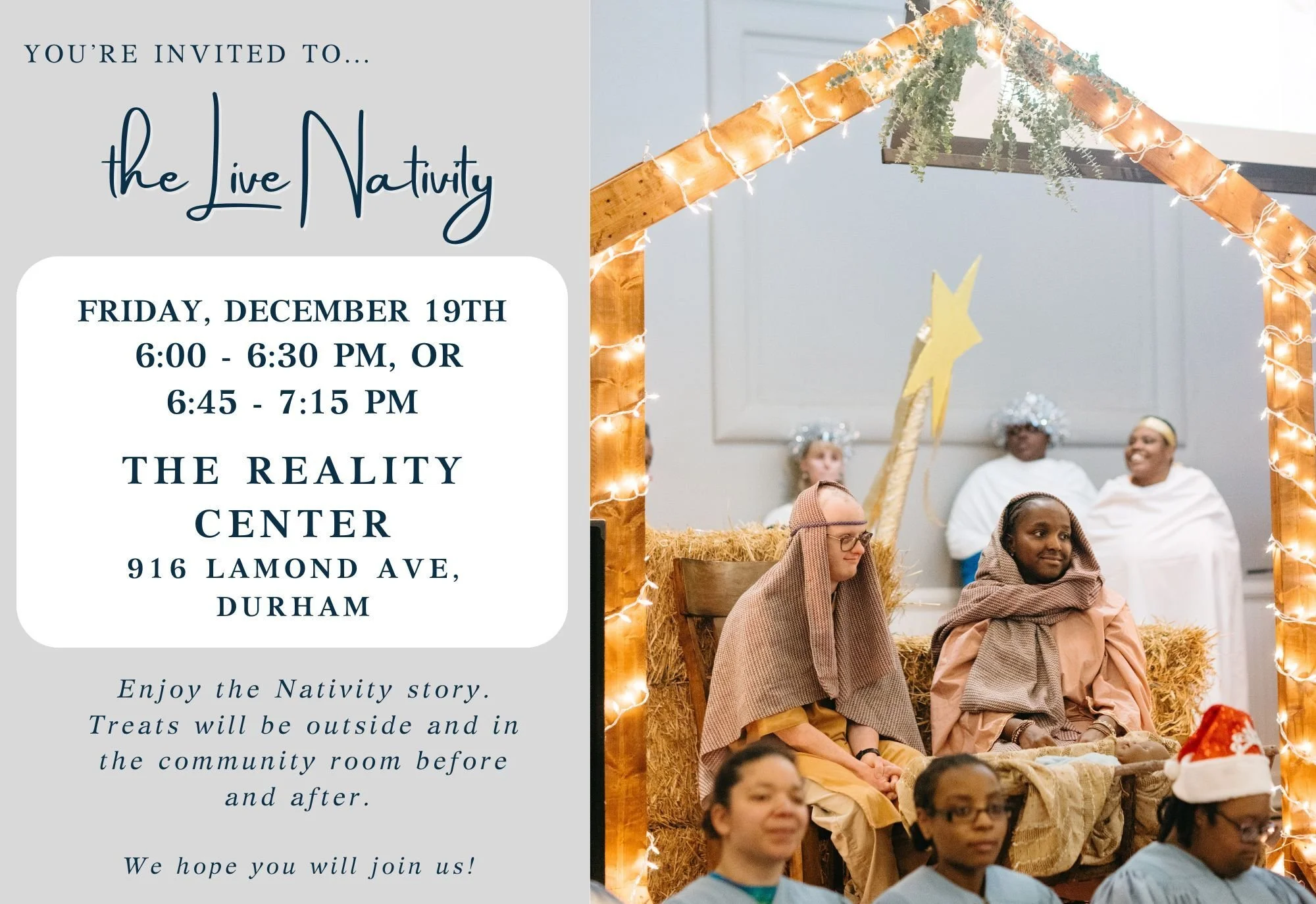 Reality Ministries Live Nativity Friday, December 19, 2025 6:00 PM 7:15 PM Google Calendar ICS Join us for an evening of carols, warm holiday treats, blessed company, and Reality Ministries’ annual presentation of the Christmas story. Bring your family and friends!